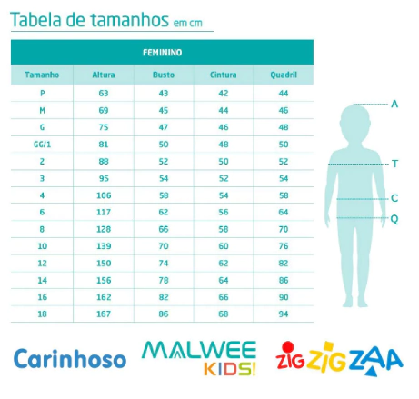Tamanho 6: Altura 117cm, tórax 60cm, quadril 65cm, cintura 58cm
