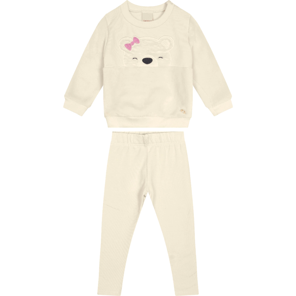 Conjunto confeccionado em pelúcia e moletom stretch flanelado. O blusão possui decote redondo, mangas longas, abertura ombro com fecho por botão de pressão e bordado frontal. A calça legging conta com cós elástico. Aposte!