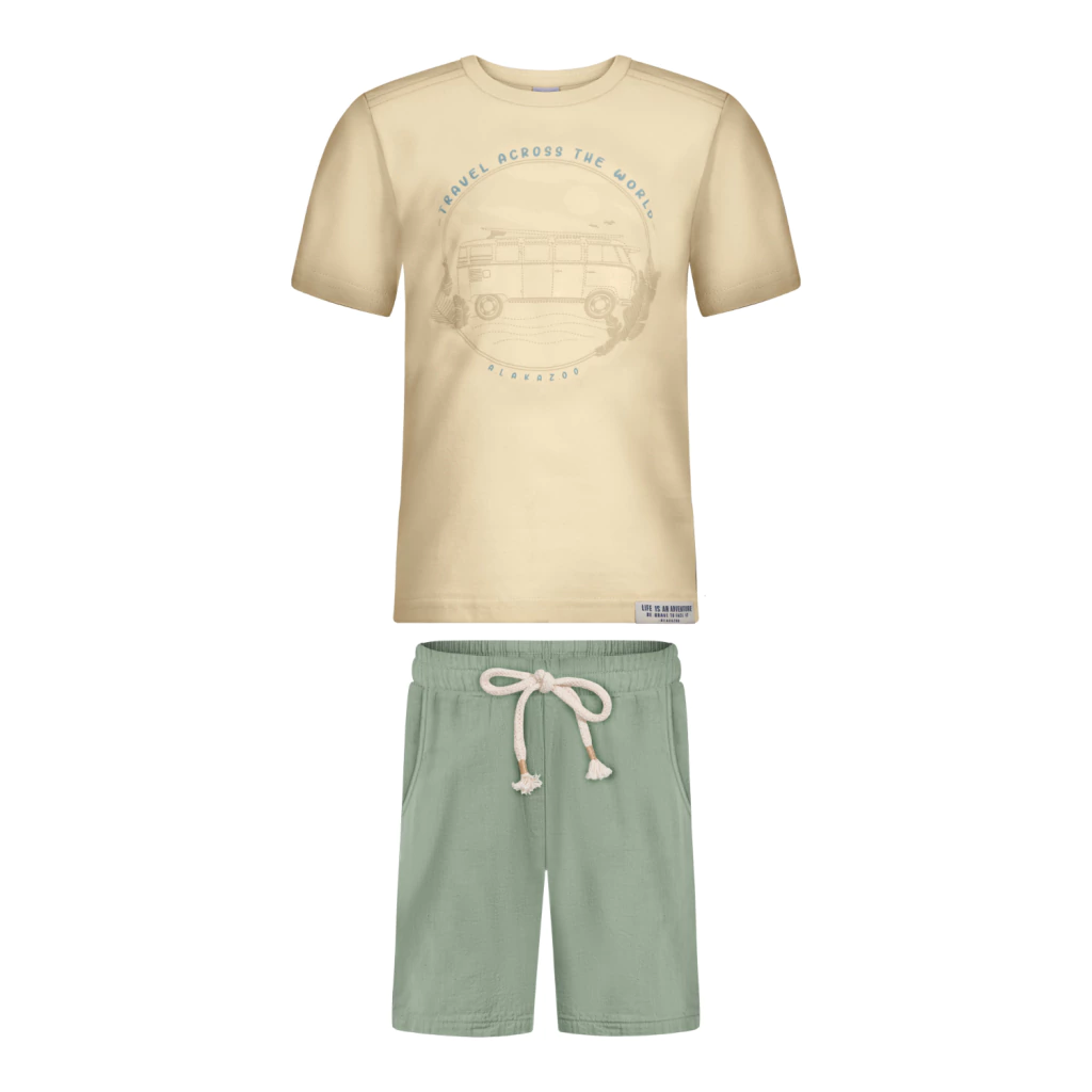 Este conjunto menino alakazoo camiseta em meia malha penteada bege com estampa de kombi e bermuda em tecido plano linho verde é perfeito para compor looks cheios de personalidade e conforto. Desenvolvido especialmente para a moda infantil, ele proporciona liberdade para brincar e explorar o mundo com estilo.