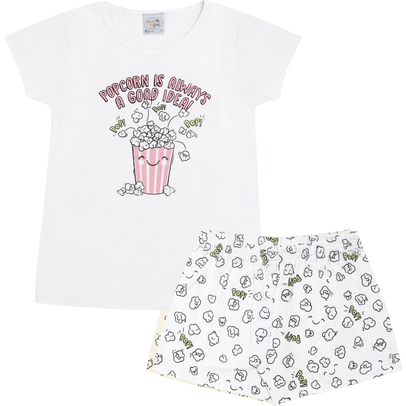 Pensando no conforto da sua princesinha na hora de dormir, a Good Night by Pulla Bulla trouxe este novo conjuntinho confeccionado em meia malha, uma Blusa com estampa de pipocas com inscrito" Pipoca e sempre uma boa idéia". com estampa que brilha no escuro e um Shortinho com estampas de pipocas. Agora a sua garotinha vai dormir com ainda mais conforto e elegância.